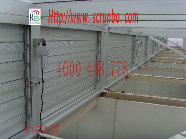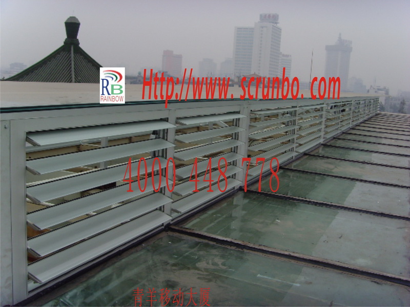 青羊移動采光中庭鋁合金電動通風百葉窗,125mm百葉窗40㎡,百葉專用電機12臺,無線電遙控及風雨感應自動關窗控制。